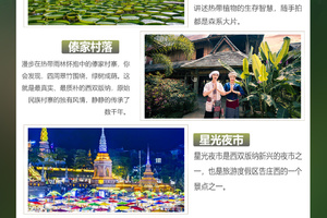 走进【傣族园】含电瓶车穿一身傣装漫步千年古寨走进,触摸真实的傣族生活走进原始傣家村寨,竹楼错落有致,看傣族先民留下的干栏式建筑。跟着村民学织傣锦、制陶,看老奶奶用古老方法舂米参与泼水狂欢(景区提供免费泼水工具),在欢声笑语中感受傣家“祝福之水”的热情。
